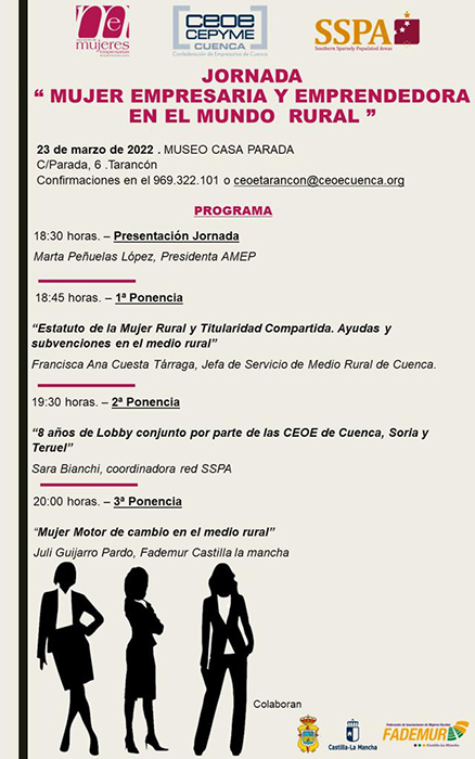Esta jornada, que ha sido organizada por CEOE CEPYME Cuenca y AMEP, se celebrará a partir de las 18:30 de la tarde en el Museo Casa Parada de Tarancón y contará con la colaboración del Gobierno Regional, el Ayuntamiento de Tarancón y FADEMUR Catilla-La Mancha.