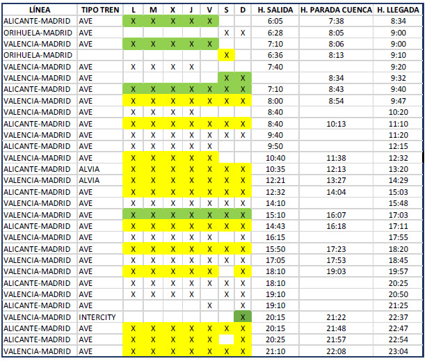 -Casilla con aspa coloreada en amarillo: circula AVE y para en Cuenca con precio AVE.