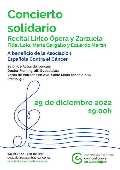 La Asociación Española Contra el Cáncer en Guadalajara celebra el próximo 29 de diciembre a las 19:00 horas, un concierto solidario ‘Recital lírico ópera y zarzuela’ de la mano de Fidel Lolo, María Gargallo y Eduardo Martín. Este evento tendrá lugar en el Centro Cultural de Ibercaja en la calle Doctor Fleming, 2B. Los fondos recaudados en este concierto serán destinados a la investigación oncológica.
