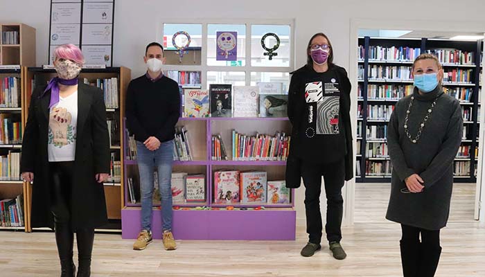 El alcalde, los concejales de Cultura y la directora de la Biblioteca inauguraron la nueva estantería, que recoge un centenar de títulos sobre Igualdad de género destinados a jóvenes, niños y niñas