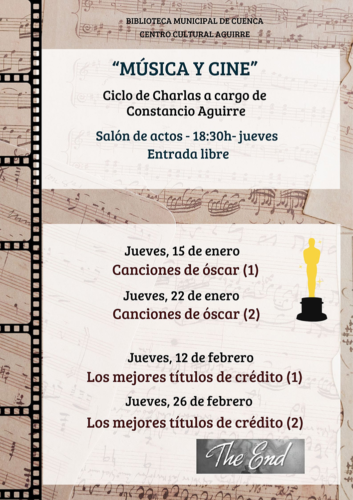 Este jueves, día 15 de enero, comienza un nuevo ciclo de charlas sobre música y cine en la biblioteca municipal de Cuenca. En esta ocasión Constancio Aguirre realizará un recorrido a través de las canciones y temas que han ganado un Oscar a lo largo de la historia.