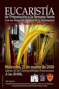 La V. H. de Jesús entrando en Jerusalén y Nuestra Señora de la Esperanza celebra mañana, miércoles 21 de marzo, una misa especial, preparatoria para la procesión del Hosanna. La eucaristía, que la Hermandad organiza por segundo año consecutivo y en esta ocasión con la Comunidad de Concepcionistas Franciscanas de la Puerta de Valencia, tendrá lugar a partir de las 20 horas en la iglesia conventual de las RR. MM. Concepcionistas.