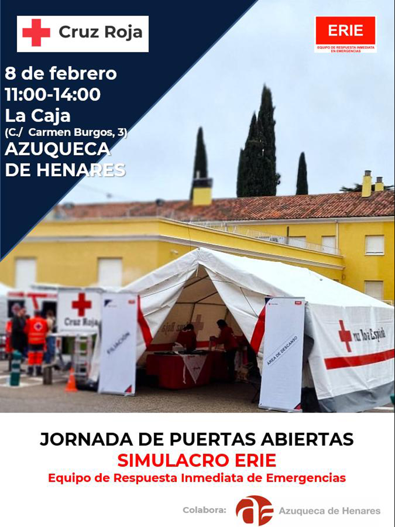 Este domingo, 8 de febrero, La Caja va a acoger un simulacro de actuación ERIE (Equipo de Respuesta Inmediata de Emergencias) de la organización Cruz Roja. Desde las 11 y hasta las 14 horas, se pondrá en marcha en este espacio multifuncional del Ayuntamiento un dispositivo especial que se activaría en el supuesto de que se produjera una emergencia (se ha elegido una hipotética inundación en Azuqueca de Henares). Se trata de una jornada de puertas abiertas, a la que puede asistir cualquier persona interesada.