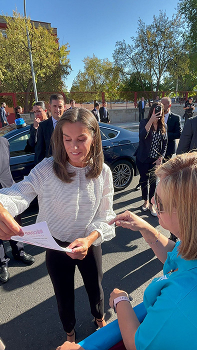 Era una ilusión, una esperanza, que la Reina Letizia se detuviera en el corrillo de Asturianos de la Casa de Asturias de Azuqueca que esperaban a las puertas del Maestra Placida. Pero todo sueño se puede cumplir y la Reina se paró, habló con los presentes y aceptó los regalos preparados para ella, 2 pines de la casa, una botella conmemorativa del récord de escanciado de este año y una invitación par este viernes para la consecución del récord.