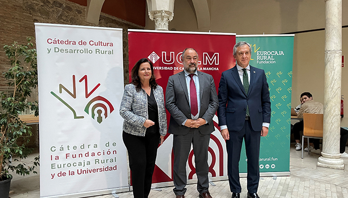Al acto de entrega, celebrado en la iglesia-paraninfo de San Pedro Mártir, en Toledo, asistieron también la directora de la Cátedra Fundación Eurocaja Rural-UCLM Cultura y Desarrollo Rural, Rebeca Rubio, y la gerente de la Fundación Eurocaja Rural, Susana Cortés.