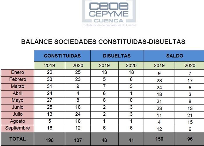 CEOE CEPYME Cuenca apunta que septiembre ha supuesto un regreso a los datos negativos en la constitución de sociedades mercantiles comprado con el año anterior, tras una leve mejoría en julio y agosto.