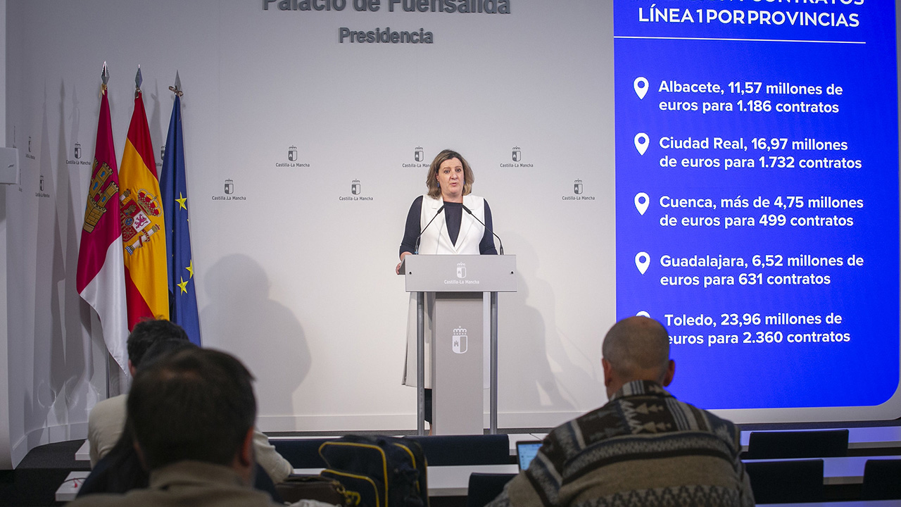La consejera ha recordado que, en el reparto provincial de la convocatoria, el detalle es el siguiente: en Albacete, una inversión conjunta de 11,57 millones de euros para 1.186 contratos, aportando más de 7 millones de euros la Junta y 4,53 millones la Diputación; en Ciudad Real, 16,97 millones de euros para 1.732 contrataciones, aportando 10,32 millones de euros la Junta y 6,65 millones la Diputación; en Cuenca, más de 4,75 millones de euros para 499 contratos, aportando 2,89 millones la Junta y 1,86 millones la Diputación; en Guadalajara, 6,52 millones de euros para impulsar 631 contratos, con casi 4 millones de euros de la Junta y 2,55 millones de la Diputación; y en Toledo, 23,96 millones de euros para apoyar 2.360 contrataciones, con 14,56 millones de euros de la Junta y 9,39 millones de la Diputación.