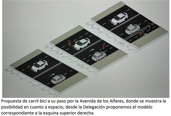 2. Nos preocupa la peligrosidad del carril bici propuesto pues en la mayoría de los tramos a excepción del que transcurre por la avenida de los Alfares se comparte o con viandantes o con coches, lo cual desincentiva a los posibles usuarios de este.