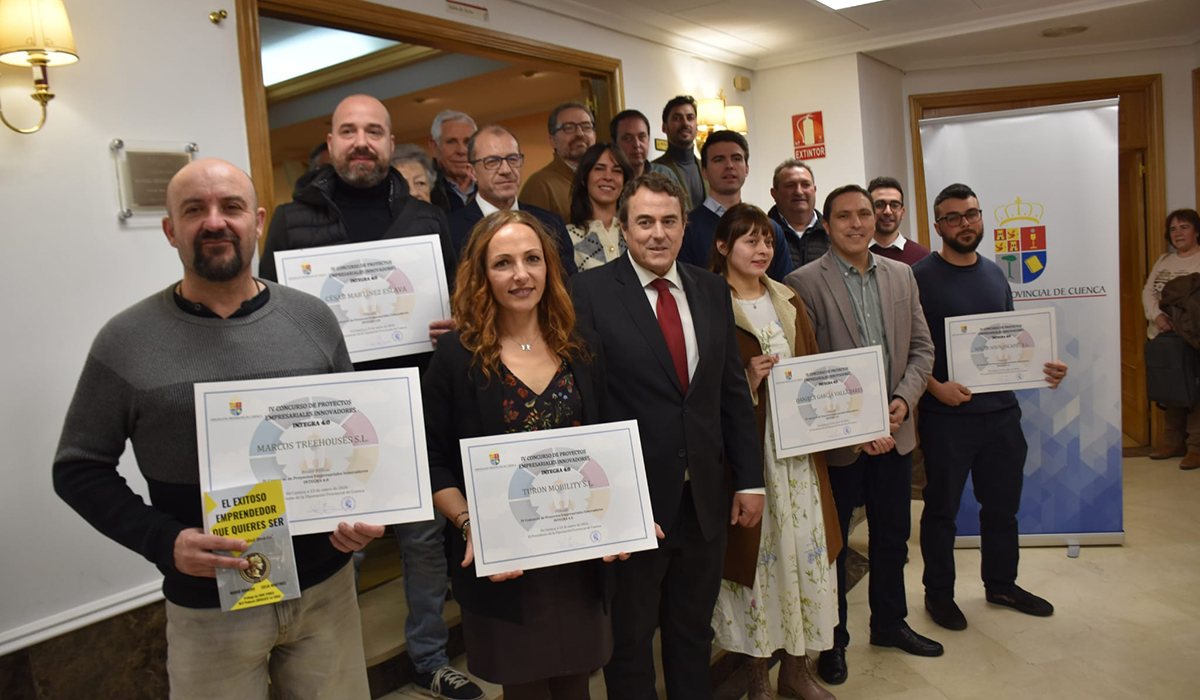 El presidente de la Diputación de Cuenca, Álvaro Martínez Chana, ha realizado la entrega de los diplomas a los nueve ganadores de la cuarta edición del concurso empresarial Integra 4.0 que en esta edición está dotado con 500.000 euros y en la que se ha alzado con la máxima puntuación la empresa Marcos Treehouses S.L.