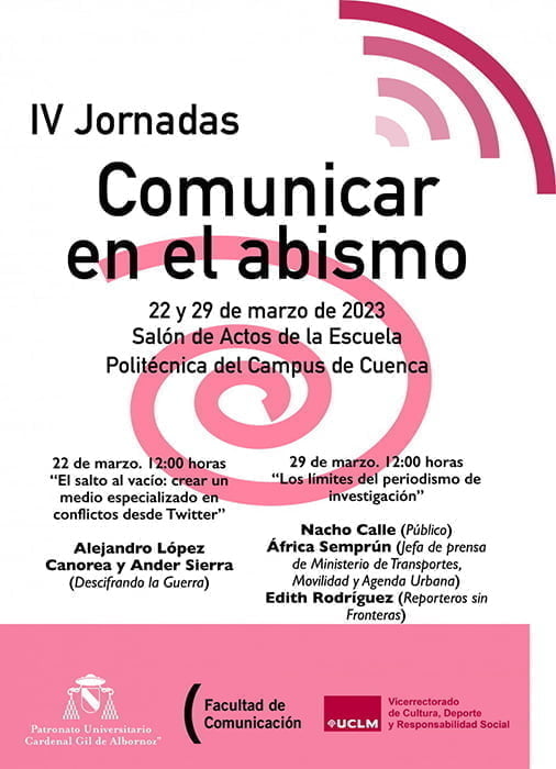 La Facultad de Comunicación de la UCLM aborda en unas jornadas los límites del periodismo de investigación y las redes como canales especializadosEl Campus de Cuenca de la Universidad de Castilla-La Mancha (UCLM) acoge los días 22 y 29 de marzo la cuarta edición de las jornadas ‘Comunicar en el abismo’, la propuesta de la Facultad de Comunicación -en colaboración con el Vicerrectorado de Cultura, Deporte y Responsabilidad Social y el Patronato Gil de Albornoz- que pretende dinamizar el debate en torno a la profesión.