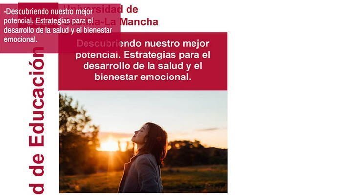 Hasta el próximo día 26 de febrero permanecerá abierto el plazo de matrícula del curso ‘Descubriendo nuestro mejor potencial. Estrategias para el desarrollo de la salud y el bienestar emocional’, iniciativa organizada por el Departamento de Psicología de la Facultad de Educación de la Universidad de Castilla-La Mancha (UCLM) en el Campus de Cuenca, a través de su Departamento de Psicología, que se celebrará del 27 de febrero hasta el 7 de marzo.