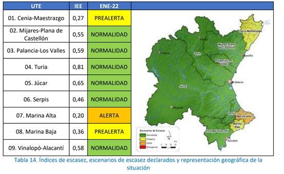 • En cuanto a los escenarios de escasez, los sistemas Cenia-Maestrazgo y Marina Baja han entrado en prealerta este mes, y el sistema Marina Alta continúa en el escenario de alerta. El resto de sistemas se encuentran en situación de normalidad.