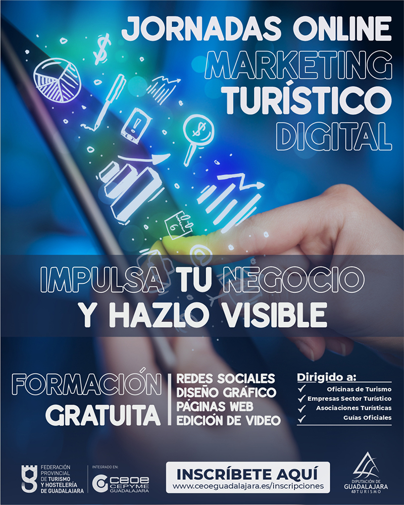 La federación provincial de Turismo y Hostelería de Guadalajara, integrada en CEOE-CEPYME Guadalajara, en colaboración con la Diputación Provincial de Guadalajara, lanzan las jornadas online de marketing turístico digital, una iniciativa gratuita destinada a fortalecer las competencias digitales de los profesionales del sector turístico.