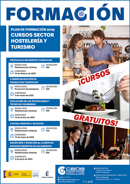 La Federación provincial de Turismo y Hostelería de la provincia de Guadalajara, integrada en CEOE-CEPYME Guadalajara, siguiendo la línea de llevar formación de calidad, adaptada al sector turístico y hostelero a todos los rincones de la provincia, ha programado, para estos próximos meses cinco cursos de formación específicos para el sector del turismo y la hostelería.