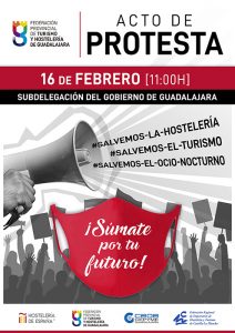 La Federación provincial de Turismo y Hostelería de Guadalajara, integrada en CEOE-CEPYME Guadalajara, ha convocado una concentración del sector de toda la provincia para el próximo martes 16 de febrero a las 11:00 horas frente a la subdelegación del Gobierno en Guadalajara, a la que está convocada toda la hostelería, el turismo, así como el ocio nocturno, proveedores, etc.