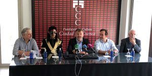 El Teatro Auditorio volverá a ser uno de los espacios de la Feria y Fiestas de San Julián, en esta ocasión con el espectáculo ‘Michael Jackson. I want U back’. Un evento que ha presentado esta mañana el alcalde de Cuenca, Darío Dolz, junto con el concejal de Educación, Cultura, Turismo y Patrimonio Histórico, Miguel Ángel Valero; el director del Teatro Auditorio, Pedro Mombiedro; y el responsable de la productora Ópera y Acción, Gonzalo Pérez. Junto a ellos, el doble de Michael Jackson, SacMJJ, y Silvia Alexandrova, responsable de Maquillaje y Vestuario.