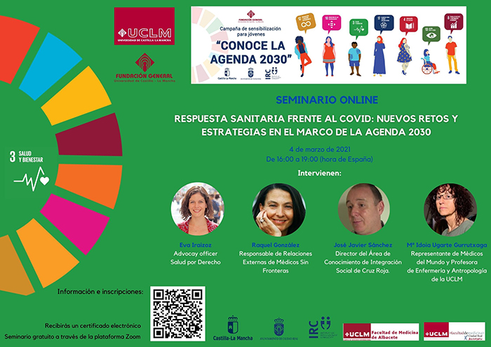 “Respuesta sanitaria frente a la COVID: nuevos retos y estrategias en el marco de la Agenda 2030” es el título del seminario que ofrecerá la Fundación General de la Universidad de Castilla-La Mancha (UCLM) el próximo 4 de marzo entre las 16.00 y las 19.00 horas. La iniciativa se desarrollará en línea a través de la plataforma Zoom, está abierta a la ciudadanía, y contará con la intervención de la abogada de Salud por Derecho Eva Iraizoz, la responsable de Relaciones Externas de Médicos Sin Fronteras, Raquel González; el representante de Cruz Roja José Javier Sánchez, y la profesora de la UCLM y miembro de Médicos sin Fronteras Idoia Ugarte Gurrutxaga. Entre otras cuestiones, se abordarán los desafíos de la salud como derecho humano fundamental o el papel de las organizaciones transnacionales para abordar estos retos.