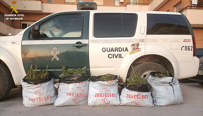 Tras un registro de los ocupantes y del vehículo, la Guardia Civil encuentra un cuchillo de grandes dimensiones oculto en el pantalón de uno de ellos y dentro del maletero cinco sacos que contenían en su interior un total de 38 kilogramos de marihuana recién cortada.