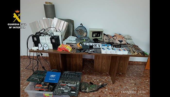 A tenor de las investigaciones y diligencias practicadas, y con la pertinente autorización judicial, durante este mes de noviembre se han llevado a cabo tres entradas y registros en los domicilios de los sospechosos; hallando en el interior numerosos efectos, herramientas, maquinaria, joyas, teléfonos móviles, los cuales fueron sustraídos del interior de vehículos y viviendas. Además, se aprehendieron 175 gramos de marihuana, dispuestos para la venta. En una de las viviendas ha sido hallada y desmantelada una instalación para una plantación indoor de marihuana.