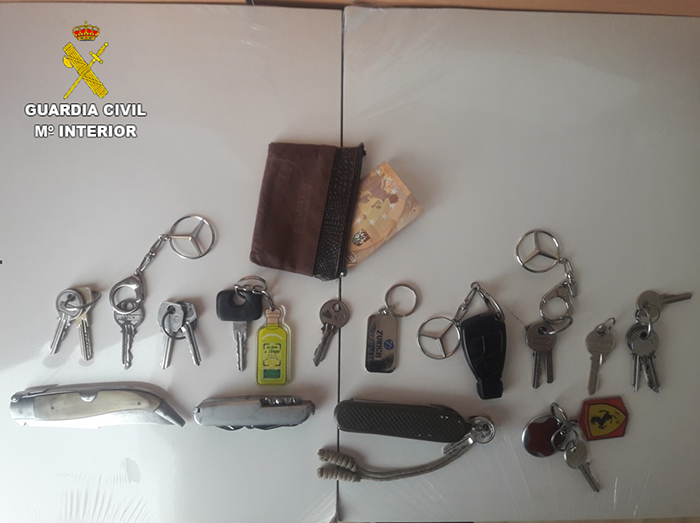 La Guardia civil recuperó la totalidad de los efectos sustraídos (diversos juegos de llaves de inmuebles y vehículos, un monedero con 100 € en billetes y tres navajas) e hizo entrega de los mismos a su legítimo propietario una vez reconocidos.