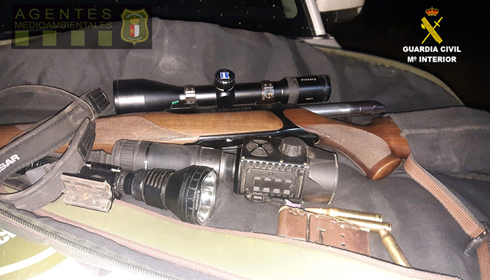Una vez que se procedió a la detención del vehículo, se verificó que en el interior circulaban tres personas, una de ellas menor de edad. Tras realizar un registro exhaustivo del vehículo, se halló en su interior un rifle, munición dispuesta para ser utilizada, dos linternas de gran potencia, un monocular térmico, casquillos coincidentes con el arma de fuego disparada y dos perros de raza teckel, que se encontraban en la parte trasera del vehículo.