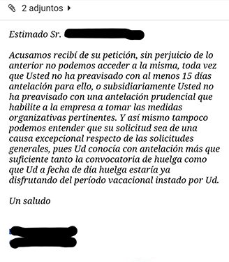 Hoy han empezado a recibir las respuestas, en las que, con un argumento peregrino, Geacam rechaza la petición y se niega a considerarles huelguistas. (Os adjunto la respuesta en cuestión)