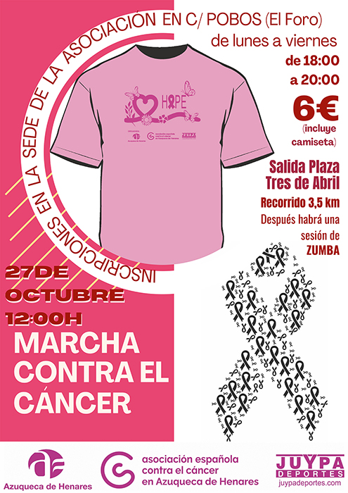 La Asociación Española contra el Cáncer en Azuqueca de Henares y el Ayuntamiento azudense vuelven a colaborar en organización de la III Marcha contra el cáncer, que se celebrará el domingo, 27 de octubre. La salida se hará a las 12 del mediodía desde la plaza 3 de Abril y se ha previsto un recorrido de 3,5 kilómetros para terminar la jornada en el mismo lugar de partida, la plaza 3 de Abril, con una sesión de zumba.