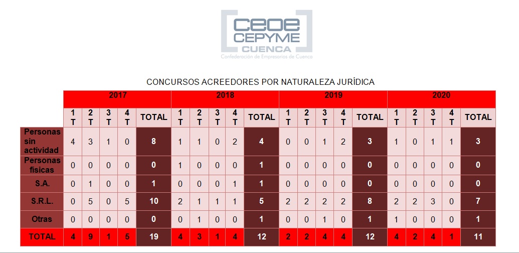 CEOE CEPYME Cuenca señala que la incidencia empresarial de los concursos de acreedores en la provincia de Cuenca ha bajado ligeramente durante el año 2020.