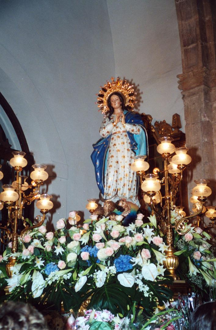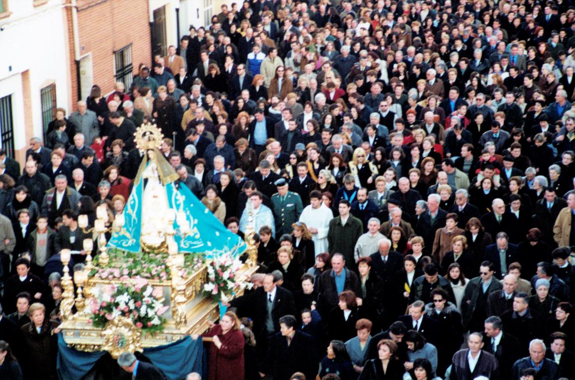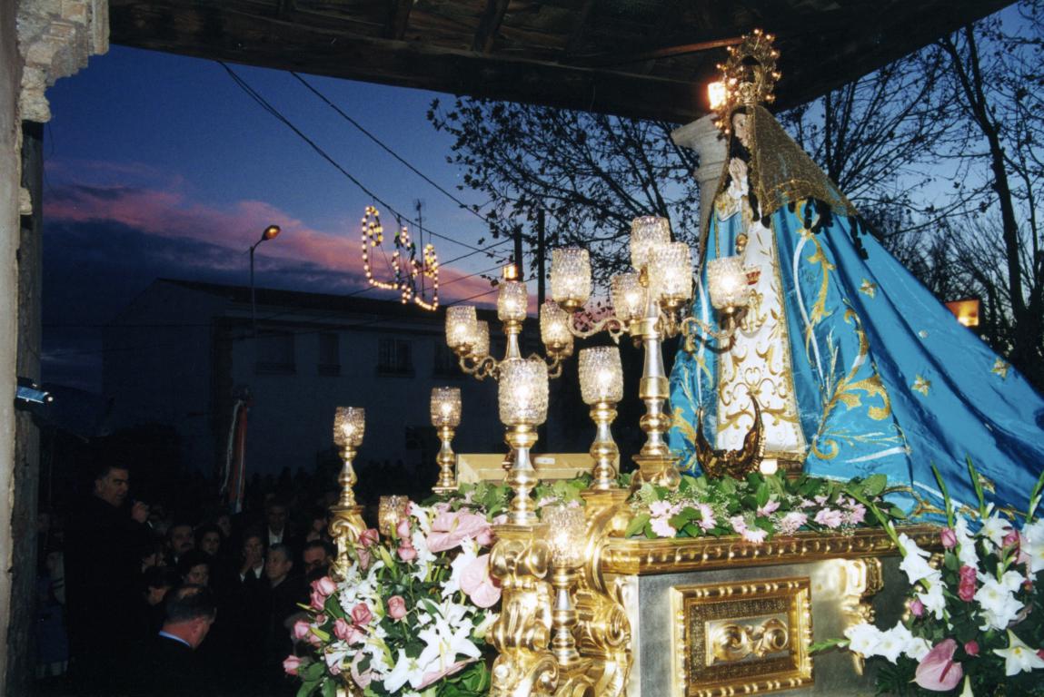 Acabada la Misa, entre ¡vivas!, rezos y lágrimas de emoción, la carroza con la imagen de la Inmaculada Concepción saldrá un año más a la calle, llevada por los miembros de la Junta administrativa y camareras, para acercarse hasta ‘su pueblo’, rodeada del vecindario y las autoridades municipales sin que le falten los sonidos de las marchas procesionales interpretadas por la Banda Municipal de Música ‘La Inmaculada’, ni tampoco una incesante cohetería.