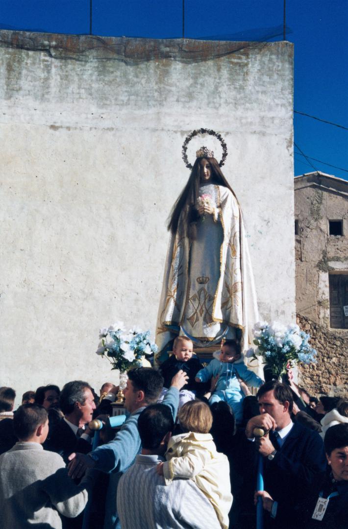 La procesión posterior es corta e intensa, muy emotiva. Sobre las andas de la Virgen, niñas y niños de corta edad, son ofrecidos por sus padres a María Inmaculada, cumplimentando una admitida tradición de años atrás. También hay subasta, como dicta la costumbre, y en la que aquellas personas que más dinero den, tendrán la satisfacción de pasar la imagen patronal dentro del templo.