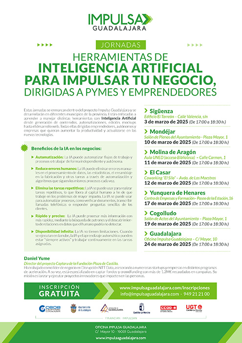 Durante el próximo mes de marzo se desarrollará un ciclo de Jornadas titulado: “Herramientas de Inteligencia artificial para impulsar tu negocio”, dirigido a pymes y emprendedores de la provincia. Dichas jornadas enfocadas a aprender a manejar distintas herramientas con Inteligencia Artificial desde generación de contenidos, automatizaciones, edición, mockups hasta el desarrollo web. El plazo de inscripción ya está abierto y todos los interesados pueden hacerlo rellenando el formulario del siguiente enlace: https://www.impulsaguadalajara.com/inscripciones