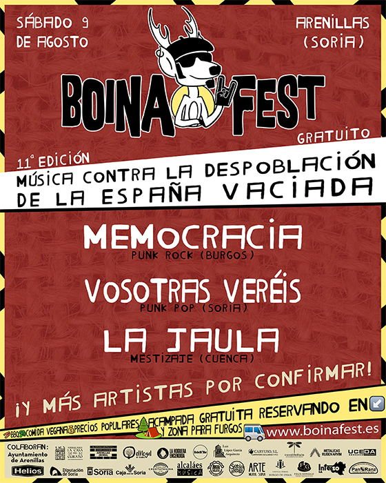 El próximo 9 de agosto se celebrará en Arenillas (Soria), la undécima edición del Boina Fest, el primer festival contra la despoblación de la España vaciada. Tras 10 ediciones en constante crecimiento, el festival anuncia hoy el primer avance del cartel con los artistas que representarán a sus provincias en Arenillas, un pequeño municipio del sur de Soria de poco más de 40 habitantes y conocido por su lucha contra la despoblación ya desde los años 80.