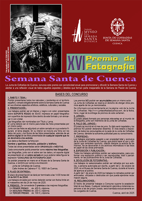 La Junta de Cofradías ha convocado la XVI edición de su Premio de Fotografía “Semana Santa de Cuenca”, con el objetivo de promocionar y difundir nuestra Semana de Pasión y alentar a una reflexión visual de todos aquellos aspectos y detalles que forman parte inseparable de nuestra celebración capital por antonomasia.