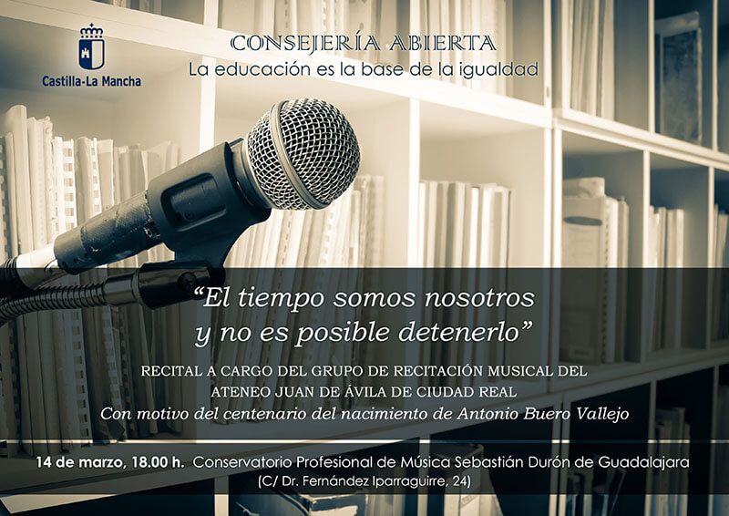 El Gobierno regional ha organizado un recital homenaje al dramaturgo Antonio Buero Vallejo, que tendrá lugar el martes, 14 de marzo, a las 18 horas, en el Conservatorio de Música Sebastián Durón, de Guadalajara. La actividad correrá a cargo del grupo de recitación musical del Ateneo Juan de Ávila, de Ciudad Real y llevará por título «El tiempo somos nosotros y no es posible detenerlo», en recuerdo de una de las conocidas frases del autor.