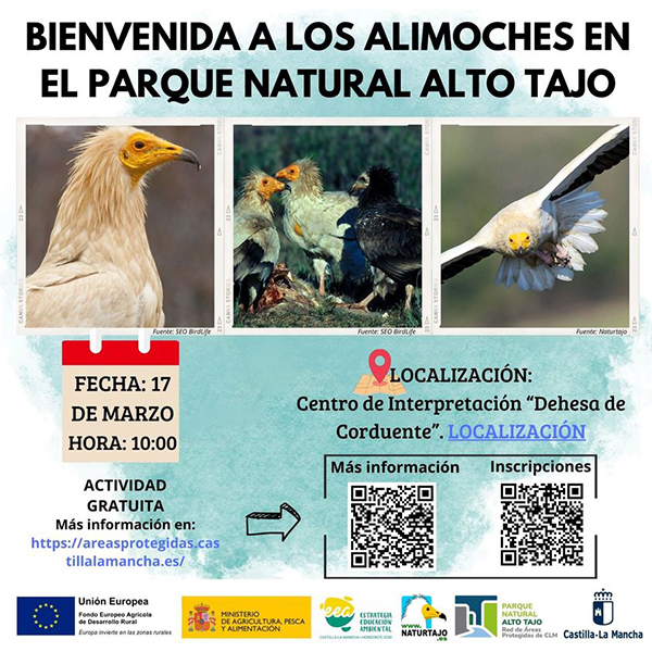 El Gobierno de Castilla-La Mancha, a través de la Consejería de Desarrollo Sostenible, ha organizado una jornada de observación de alimoches en el Parque Natural del Alto Tajo, un ave necrófaga que habita en nidos aislados y alejados de los otros ejemplares. “Tras pasar los meses más fríos en África, los alimoches inician su migración y vuelven a su entorno habitual durante el mes de marzo por lo que el final del invierno es el momento idóneo para observar estas aves en su máximo esplendor, especialmente en el Alto Tajo, uno de nuestros parques naturales en los que se registran las mayores poblaciones reproductoras de alimoche en el mundo”, ha destacado el viceconsejero de Medio Ambiente, José Almodóvar. Esta actividad gratuita, enmarcada dentro de la Estrategia de Educación Ambiental de Castilla-La Mancha y del programa ‘Vive tu Espacio’, se celebrará el 17 de marzo en el Centro de Interpretación de Corduente (Guadalajara) y es el primer acto de los numerosos acontecimientos vinculados a Feria ‘NaturTajo 2024’ que tendrá lugar en el mes de junio. Más información e inscripciones en el siguiente enlace: https://acortar.link/nCLWhf