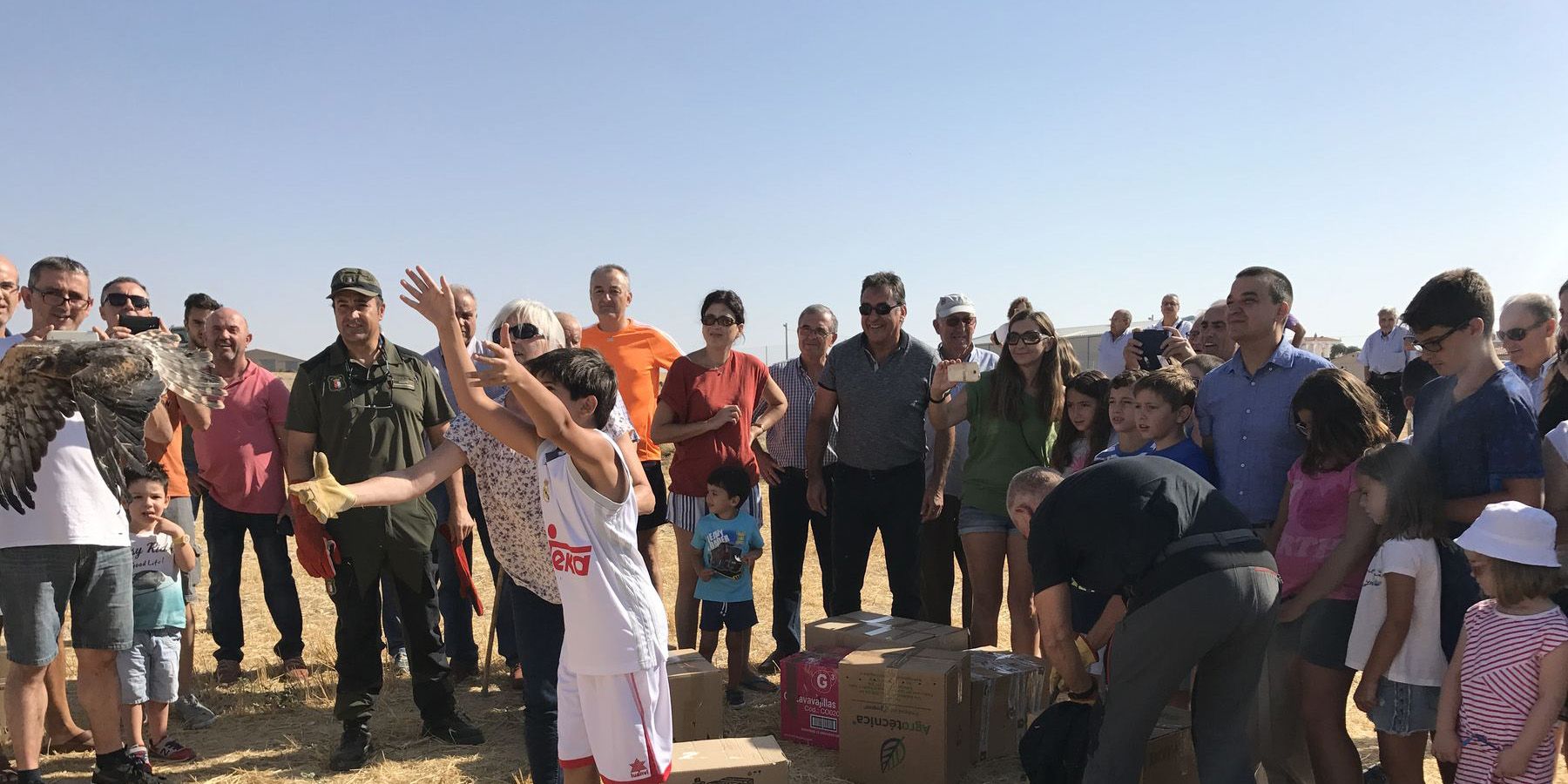 El consejero de Agricultura, Medio Ambiente y Desarrollo Rural, Francisco Martínez Arroyo, ha asistido al momento en el que los agentes medioambientales y técnicos han liberado 11 aguiluchos cenizos y 6 aguiluchos laguneros en Vara de Rey, acompañados por la alcaldesa, Anunciación Martínez Serrano; el delegado de la Junta en la provincia, Ángel Tomás Godoy, agricultores y niños del municipio.