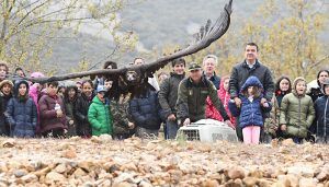 Cerca de medio centenar de alumnos de entre 8 y 10 años del Colegio Público ‘San José de Calasanz’, de Los Yébenes, así como una veintena de escolares del centro educativo ‘Inmaculada Concepción’, de la localidad toledana de Totanés; junto a sus profesores, el alcalde de Los Yébenes, Anastasio Priego y miembros de la corporación local, así como el director provincial de Toledo, Jose Luis Rojo, agentes medioambientales y profesionales del centro de El Chaparrillo, entre otros, han participado en la jornada de esta mañana de una “experiencia irrepetible” en Los Montes de Toledo, donde Bubu, un joven macho, ha sido devuelto a su hábitat natural.