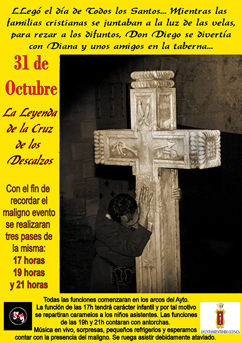 Con motivo de la festividad de Todos los Santos la Concejalía de Cultura ha organizado una serie de funciones junto a Engatos Teatro que tendrán lugar el lunes 31 de octubre y en las que se recrea la Leyenda de la Cruz de los Descalzos.