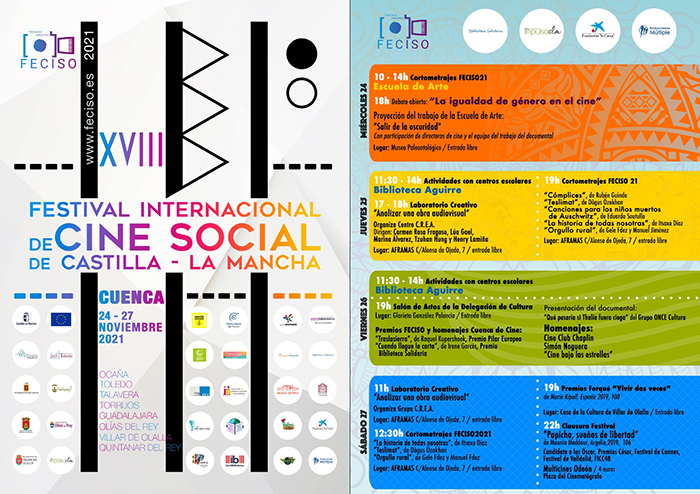 El Festival Internacional de Cine Social de Castilla-La Mancha (Festival FECISO) arranca su programación en Cuenca con la mujer como protagonista en distintas áreas cinematográficas (dirección, interpretación, producción, etc.). Bajo el epígrafe “La igualdad de gpe largometrajes y cortometrajes, debates abiertos o laboratorios creativosista en distintas rogramaciénero en el cine” y con un fuerte apoyo de las asociaciones locales y del tejido escolar de la localidad, desde mañana miércoles hasta el sábado, 27 de noviembre, esta cita con el cine social celebrará diversas actividades, la mayor parte de ellas gratuitas, como proyecciones de largometrajes y cortometrajes, debates abiertos o laboratorios creativos.