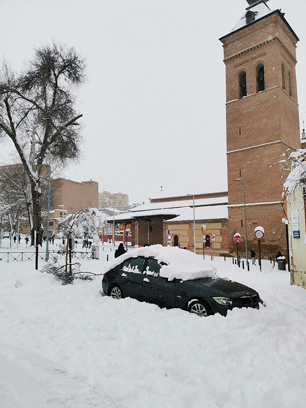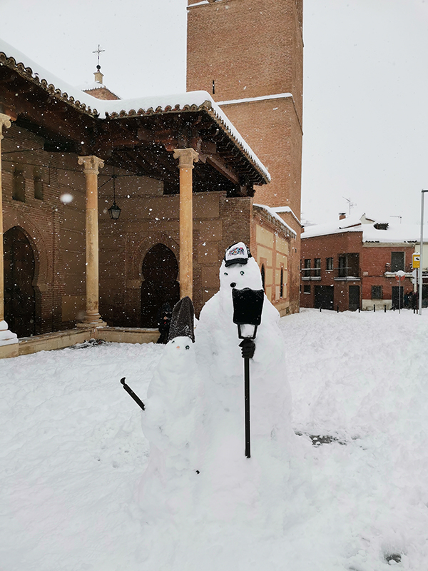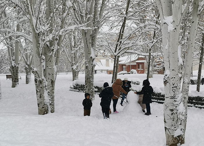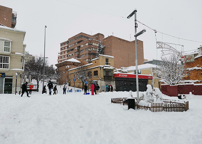 La nieve, que sigue cayendo a la hora de comer de este sábado en Guadalajara, está dejando estampas históricas. Poca gente recuerda una nevada de tales dimensiones sobre la capital guadalajareña y por la calle lo normal es encontrarse con gente con trineos, esquíes, bastones…. Y niños disfrutando como nunca lo habían hecho en su ciudad.