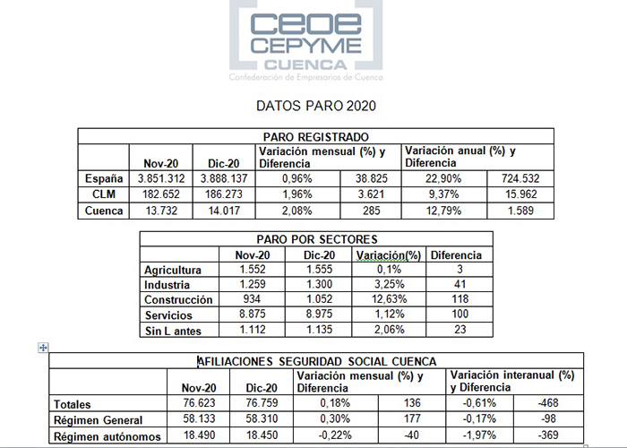 La Confederación de Empresarios de Cuenca ha estudiado estas cifras que desvelan un incremento de 1.589 parados más en 2020 respecto al número con el que se cerró 2019, un aumento del 12,79% que deja nuevamente los desempleados por encima de los 14.000 a final de año, concretamente 14.017.