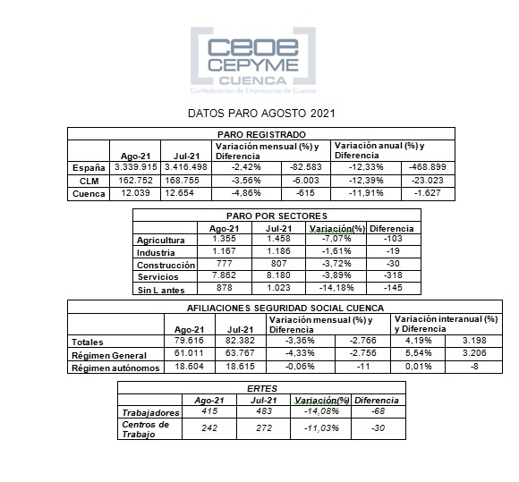 CEOE CEPYME Cuenca señala que el Ministerio de Trabajo y Economía Social ha publicado que el paro en Cuenca se sitúa en 12.039 personas, con 615 menos que en julio, un descenso del -4,86%.