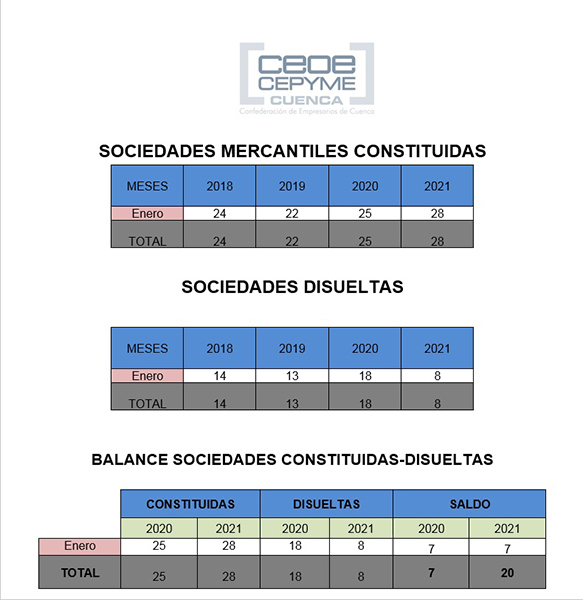 La patronal conquense remarca los buenos datos de sociedades mercantiles en el mes de eneroCEOE CEPYME Cuenca remarca los buenos datos de sociedades mercantiles que se han producido en el mes de enero en la provincia, más si cabe en una provincia como la nuestra que necesita de mayor tejido productivo.