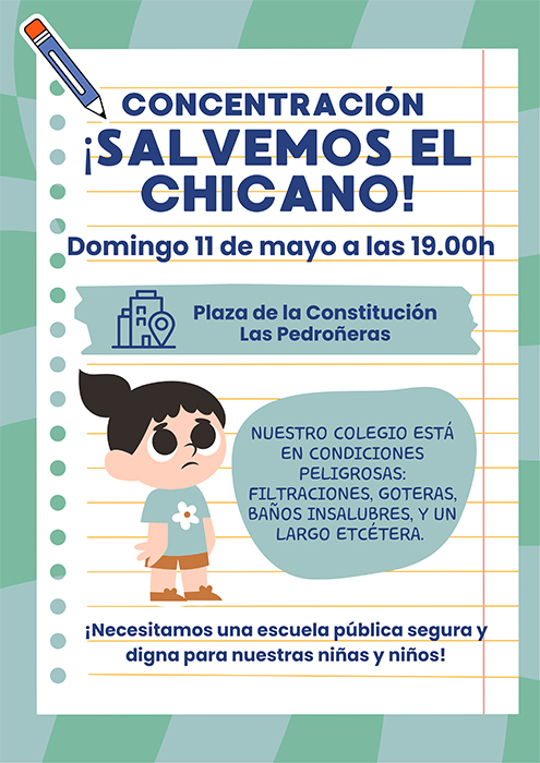 La Plataforma «Salvemos El Chicano» llevará a cabo una nueva concentración el próximo domingo 11 de mayo en la Plaza de la Constitución para denunciar las «condiciones peligrosas» en las que se encuentra el colegio El Chicano. La movilización busca reclamar una escuela pública segura y digna para los niños y niñas de la localidad.