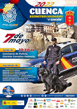 La Policía Nacional celebra en Cuenca una de sus carreras solidarias “Ruta 091”La Policía Nacional está ultimando los detalles en la organización de la I Carrera Solidaria RUTA 091 que se va a celebrar el próximo sábado 07 de mayo de 2022 a partir de las 17:30 horas en la Glorieta Gonzalez Palencia, a favor de la Asociación Cultural de Sordos de Cuenca (ASCOC).
