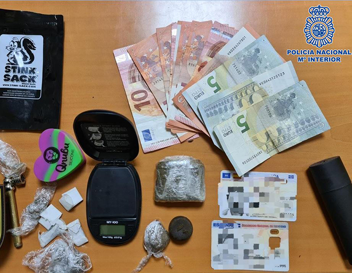 A los dos hombres se les intervino diversos envases contenedores, que utilizaban para ocultar hasta un total de 14 trozos de hachís distribuidos entre la ropa, una báscula de precisión y dinero en efectivo, por lo que fueron arrestados.