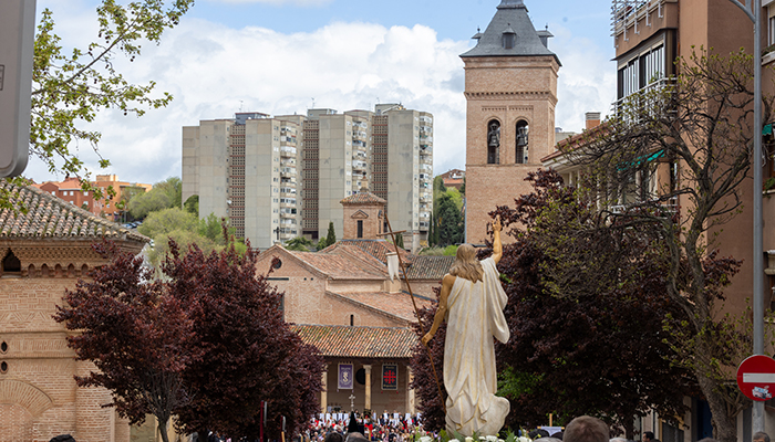 Cientos de feligreses acompañaron el paso de Cristo Resucitado, y otros muchos más se agolpaban en la plaza de la concatedral, donde se realiza el emotivo encuentro entre con la Virgen de los Dolores, justo a las puertas de la concatedral, con el obispo, Julián Ruiz Martorell, presidiendo el rezo del tradicional ‘Via Lucis’ en honor a la Resurrección.