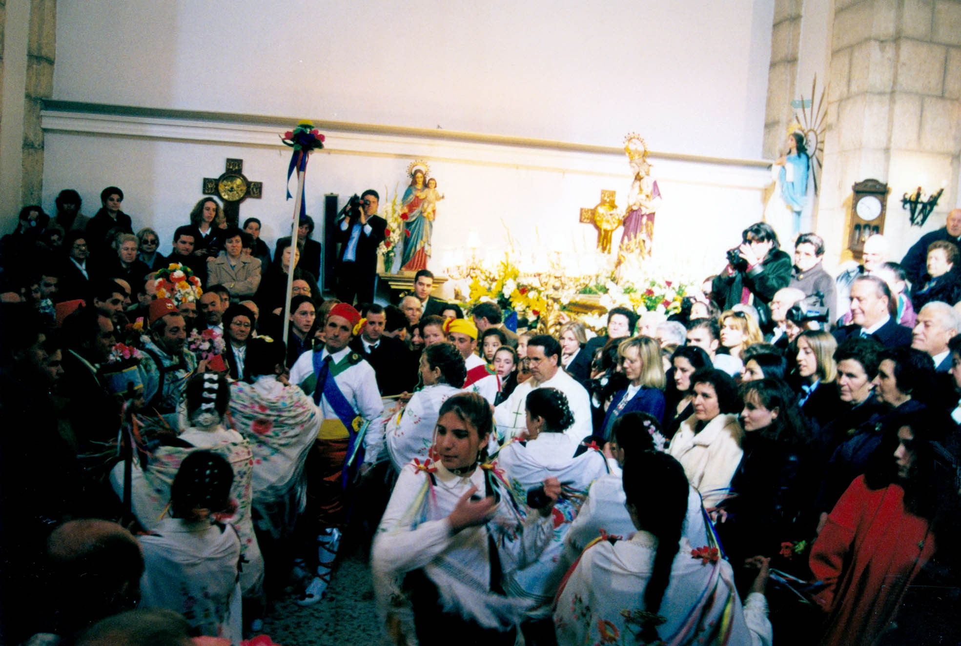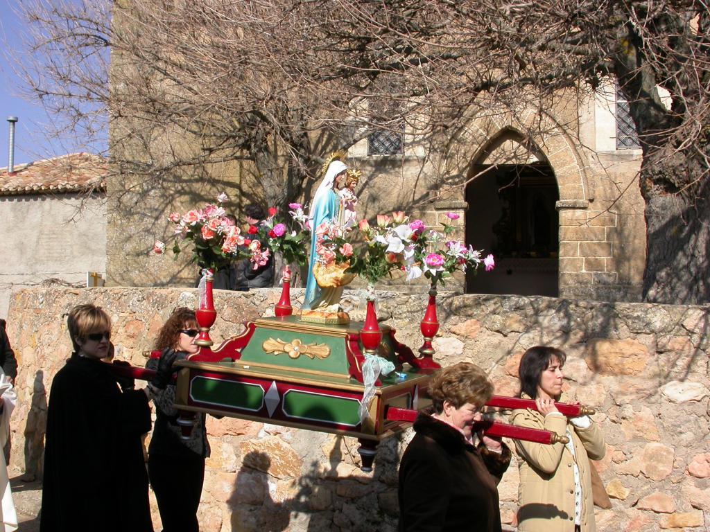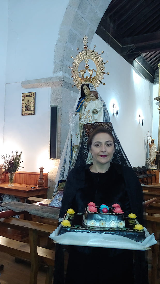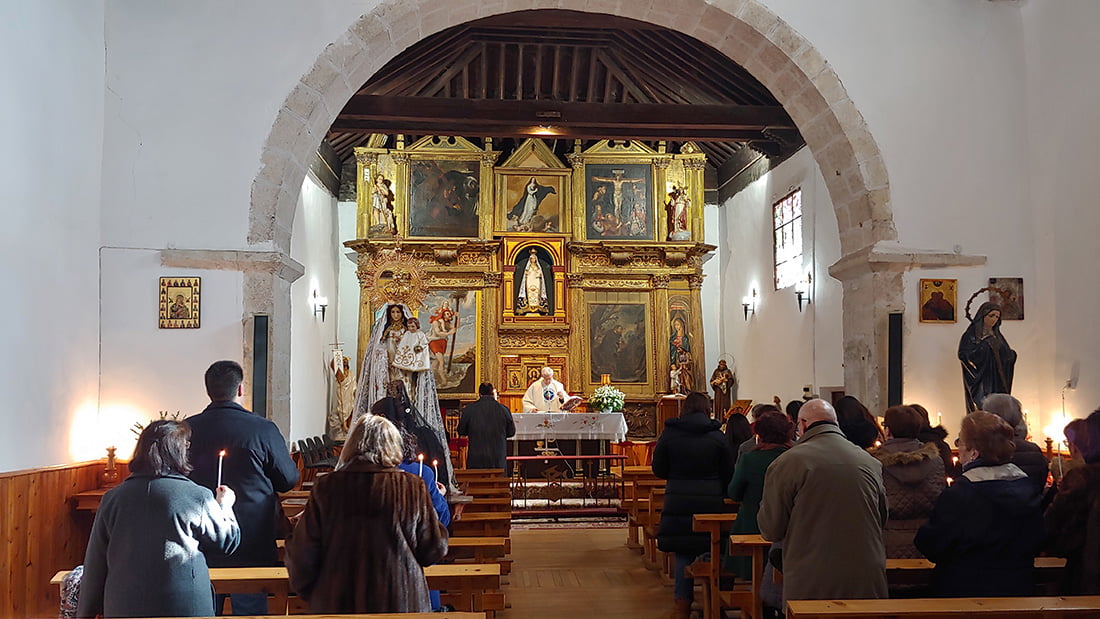En el templo parroquial, de una nave, está la torta colocada en andas y, detrás, cubierta literalmente de flores, la imagen de la Virgen. Es curioso que, en esta nave central, a un lado están las mujeres y, al otro, los hombres. El párroco ha bendecido después la torta y, a continuación, han ofrecido en sus brazos a la Candelaria a las niñas y niños de corta edad presentados por sus familiares cuando comienza la corta procesión en la que, en primer lugar, se ha situado la torta llevada en andas por los mayordomos, seguida por la imagen de la Virgen transportada sobre los hombros de las mayordomas. Así han dado la vuelta al parque de la plaza y han regresado al templo en un recorrido de apenas cinco minutos de duración durante el cual, Susana, en representación de sus compañeras, no ha cesado de tirar anises sobre las andas de la Virgen como preludio de esta plegaria final: