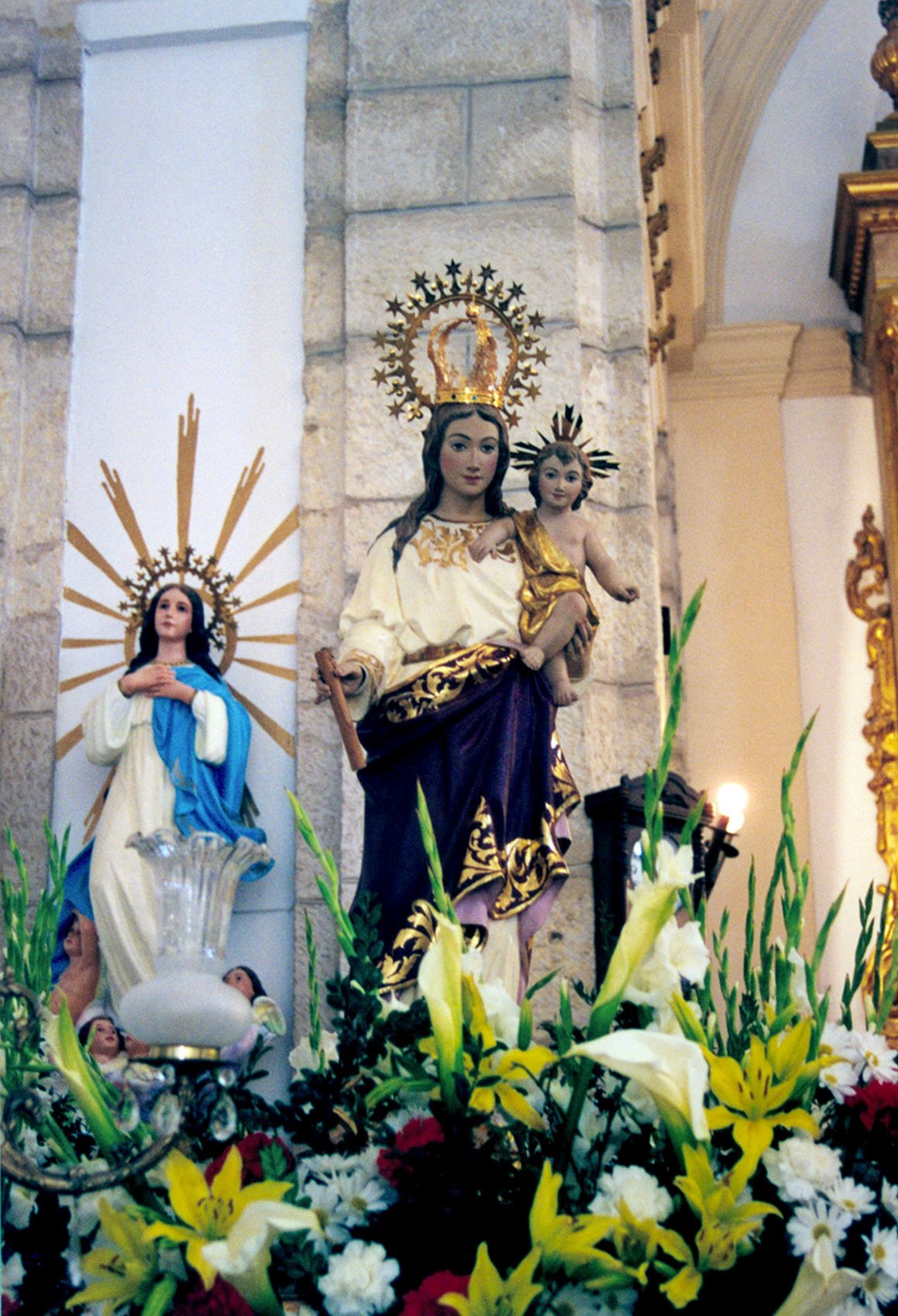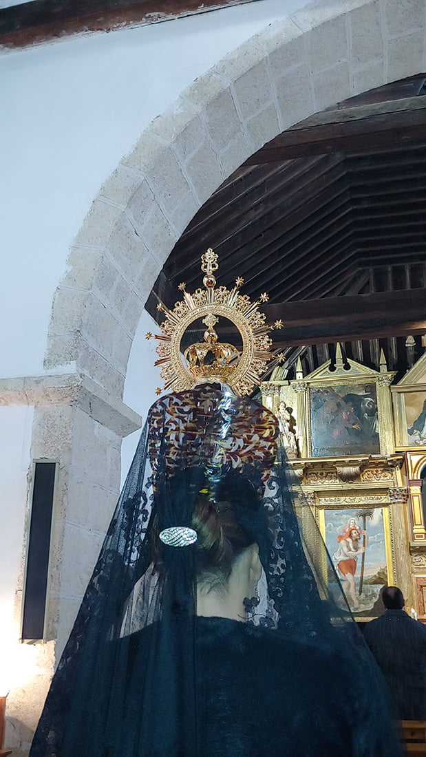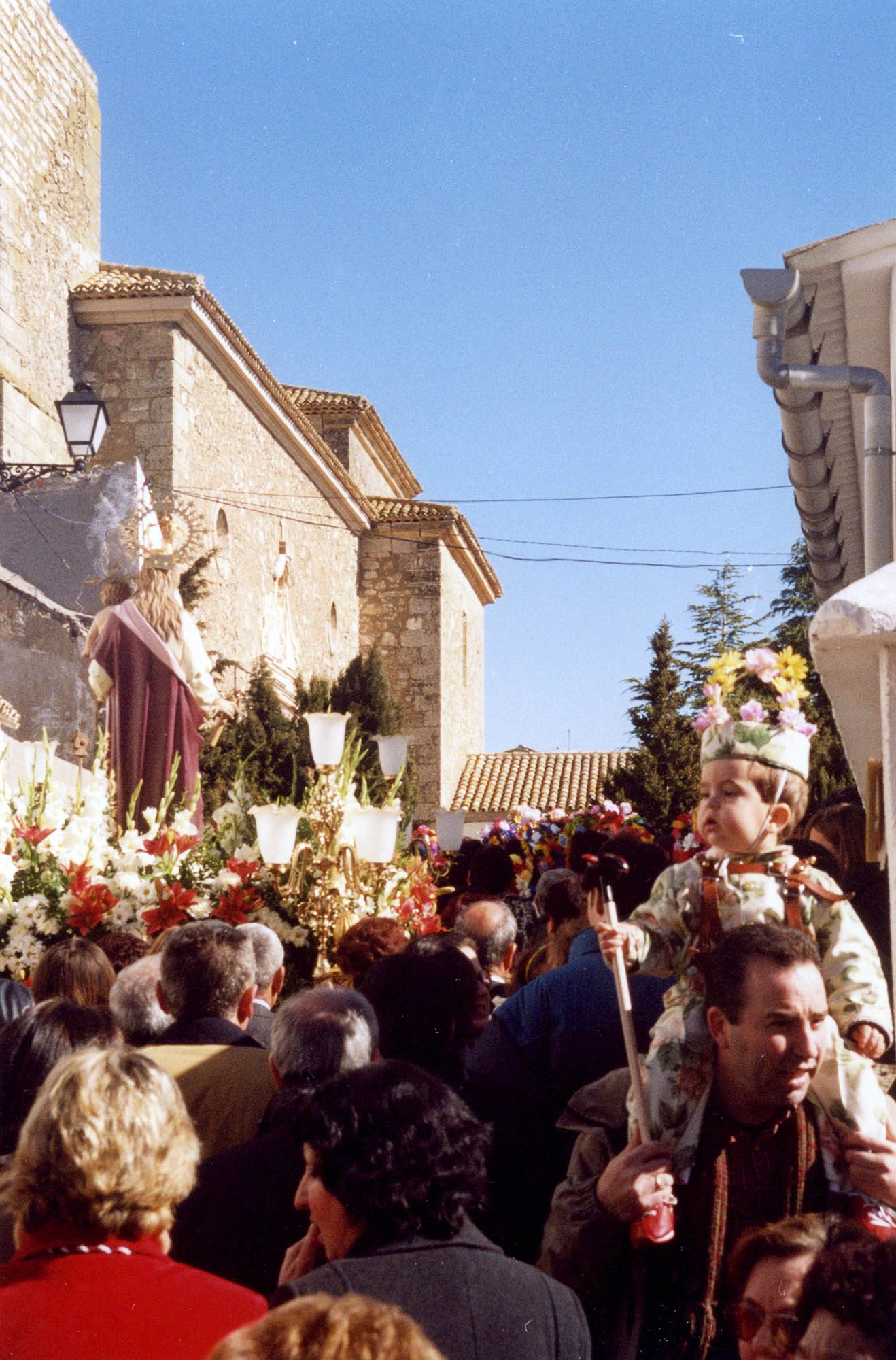 En el templo parroquial, de una nave, está la torta colocada en andas y, detrás, cubierta literalmente de flores, la imagen de la Virgen. Es curioso que, en esta nave central, a un lado están las mujeres y, al otro, los hombres. El párroco ha bendecido después la torta y, a continuación, han ofrecido en sus brazos a la Candelaria a las niñas y niños de corta edad presentados por sus familiares cuando comienza la corta procesión en la que, en primer lugar, se ha situado la torta llevada en andas por los mayordomos, seguida por la imagen de la Virgen transportada sobre los hombros de las mayordomas. Así han dado la vuelta al parque de la plaza y han regresado al templo en un recorrido de apenas cinco minutos de duración durante el cual, Susana, en representación de sus compañeras, no ha cesado de tirar anises sobre las andas de la Virgen como preludio de esta plegaria final: