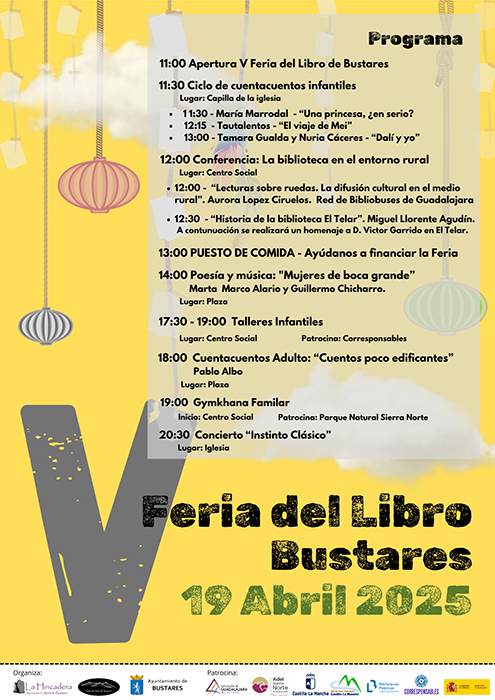El sábado 19 de abril todos los amantes de la literatura tienen, de nuevo, una cita en la localidad serrana de Bustares (Sierra Norte de Guadalajara). El Ayuntamiento de Bustares y la Asociación Cultural La Hincadera presentan una nueva edición de la Feria del Libro, el evento más importante relacionado con la literatura en el norte de la región.